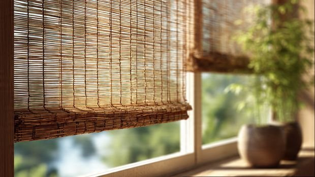 Bamboo shades provide warmth and natural texture, perfect for small spaces.