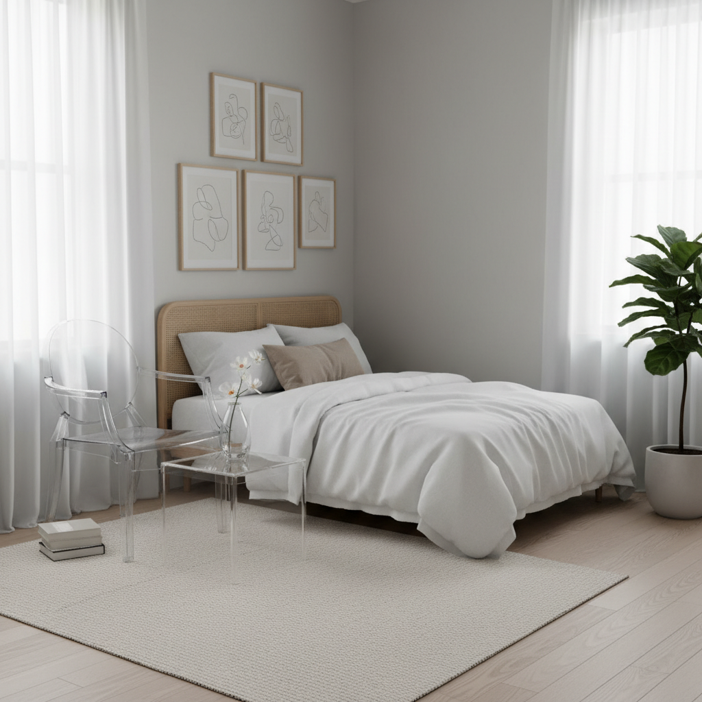 Ghost furniture, made from transparent acrylic or glass, creates the illusion of more space because it doesn’t visually block the room. An acrylic chair, a glass-top nightstand, or a clear console table can add functionality without adding visual weight. This creates a modern, almost ethereal mood, making the room feel larger and brighter.