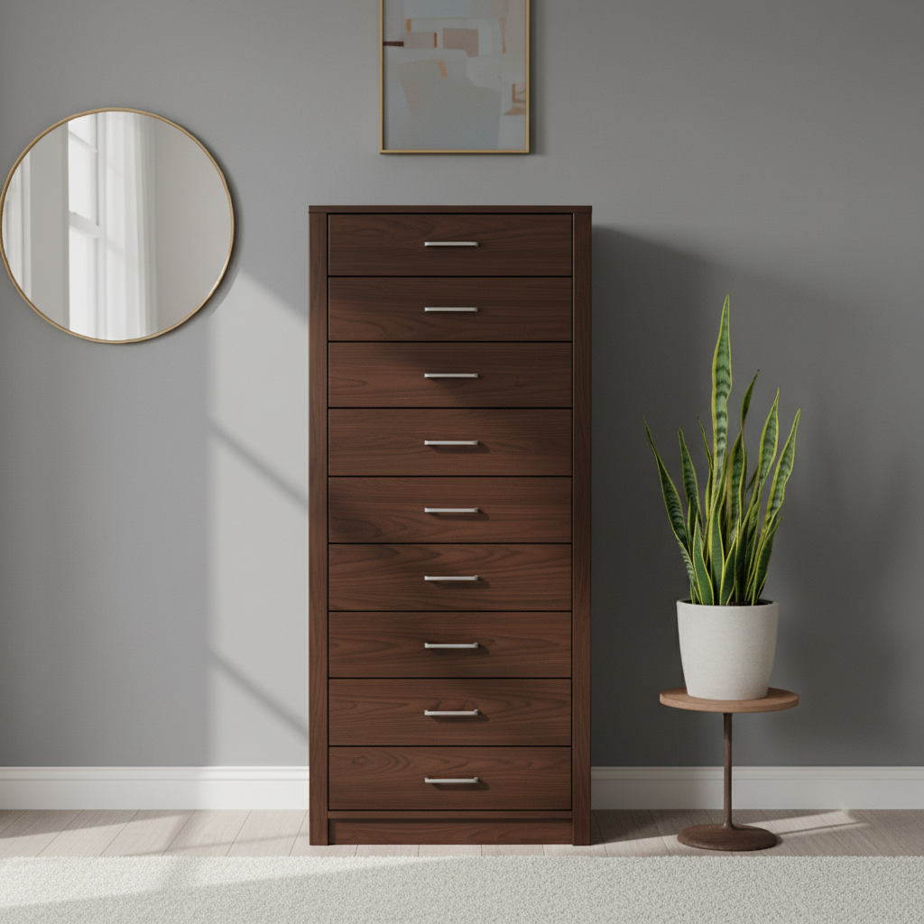 When a full-sized dresser is too wide, opt for a tall, slim-profile version. These pieces offer ample vertical storage without consuming much floor space. Choose one with clean lines, perhaps in a white lacquer, light wood, or a subtle metallic finish to keep the room feeling open and refined. The mood is chic and efficient.