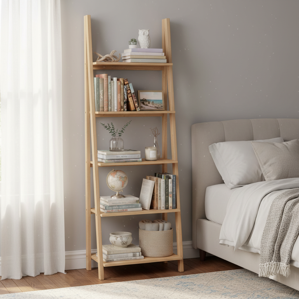 A ladder shelf leans against the wall, offering vertical storage without a heavy footprint. Its open design prevents it from feeling bulky, making it perfect for displaying books, plants, or decorative items. Choose a light wood or metal frame to maintain an airy feel, adding a touch of contemporary charm.
