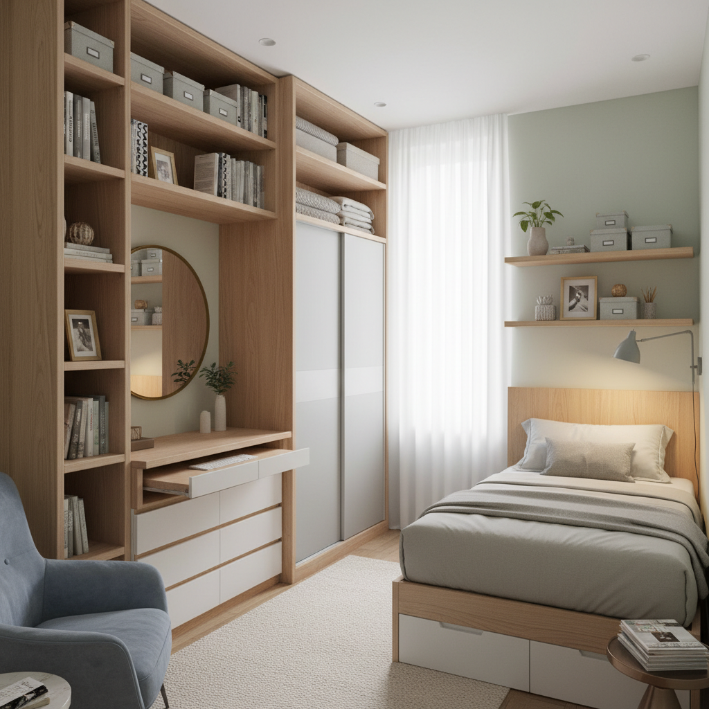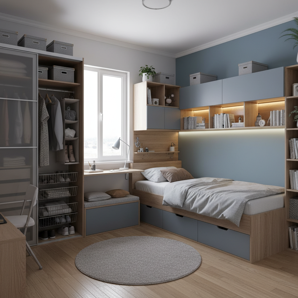 Beyond furniture, smart storage accessories and thoughtful planning can drastically improve the functionality of a small bedroom.