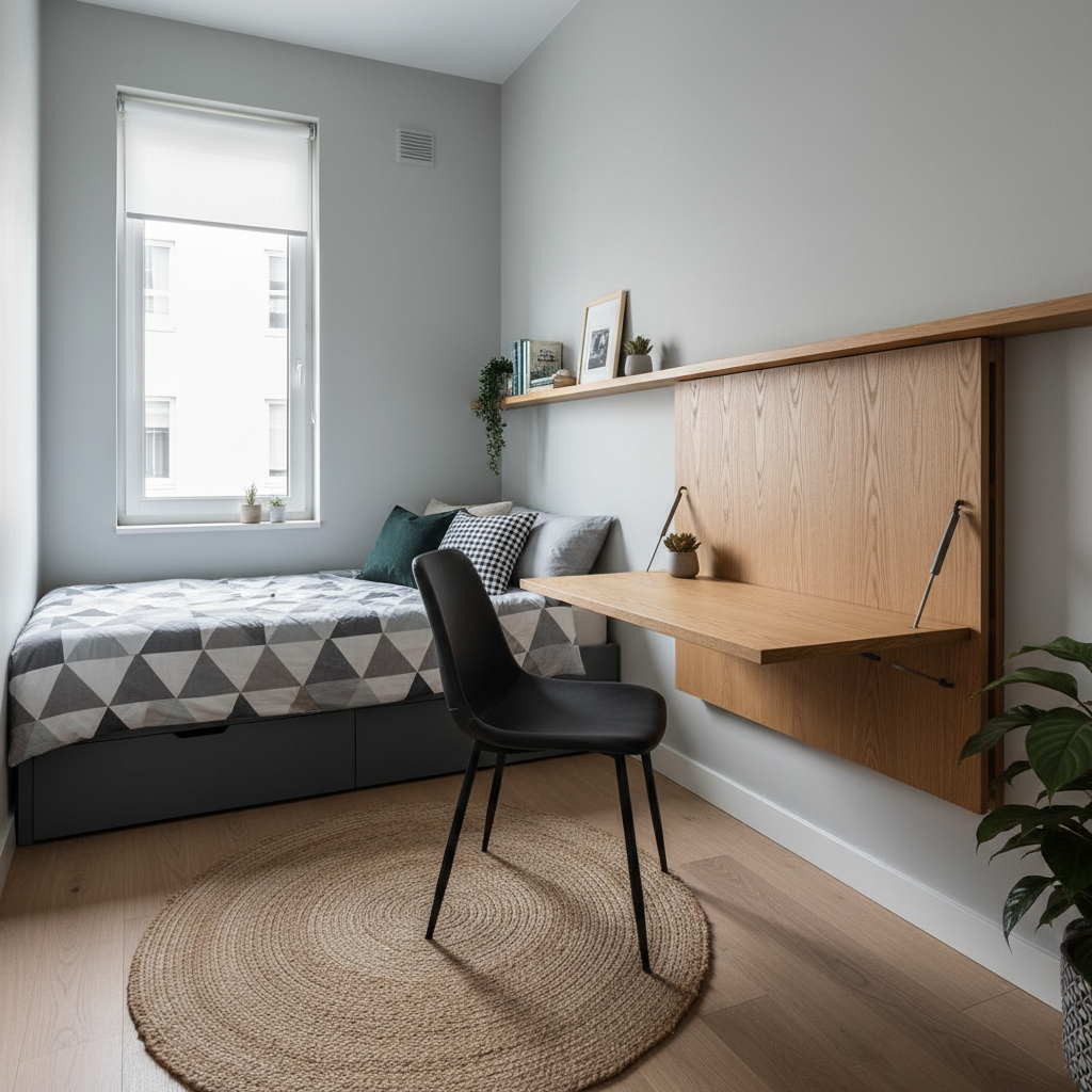 For those needing a workspace in their bedroom, a wall-mounted fold-down desk is a game-changer. It provides a functional surface when needed and disappears neatly when not in use, preserving valuable floor area. Choose a desk in a natural wood finish or a crisp white to blend seamlessly with your decor. The mood is one of efficient versatility, perfect for modern living.