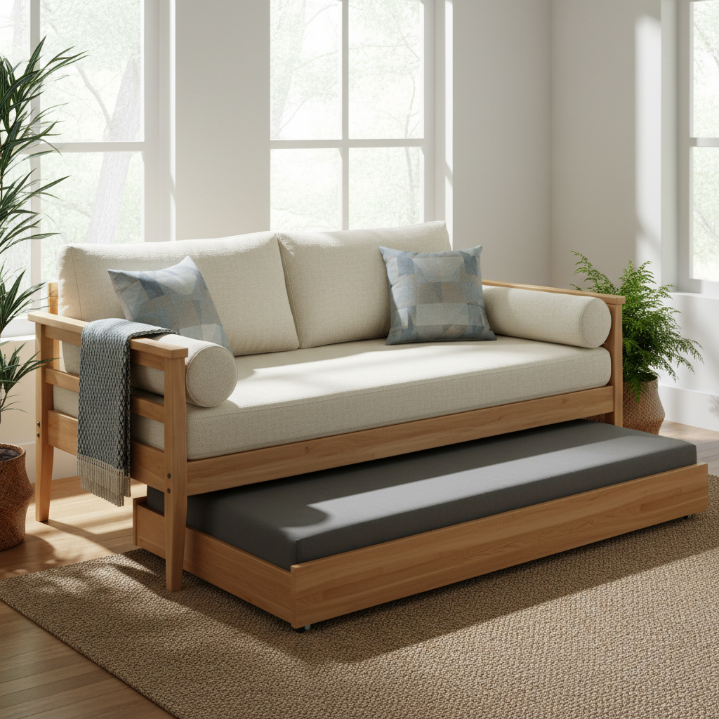 A daybed serves as both a sofa and a bed, making it ideal for multi-functional small rooms. Add a trundle bed underneath, and you have instant guest accommodation. Dress it with plush cushions and throws during the day to create an inviting seating area. Light fabrics and a soft color scheme enhance its versatility and comfort.
