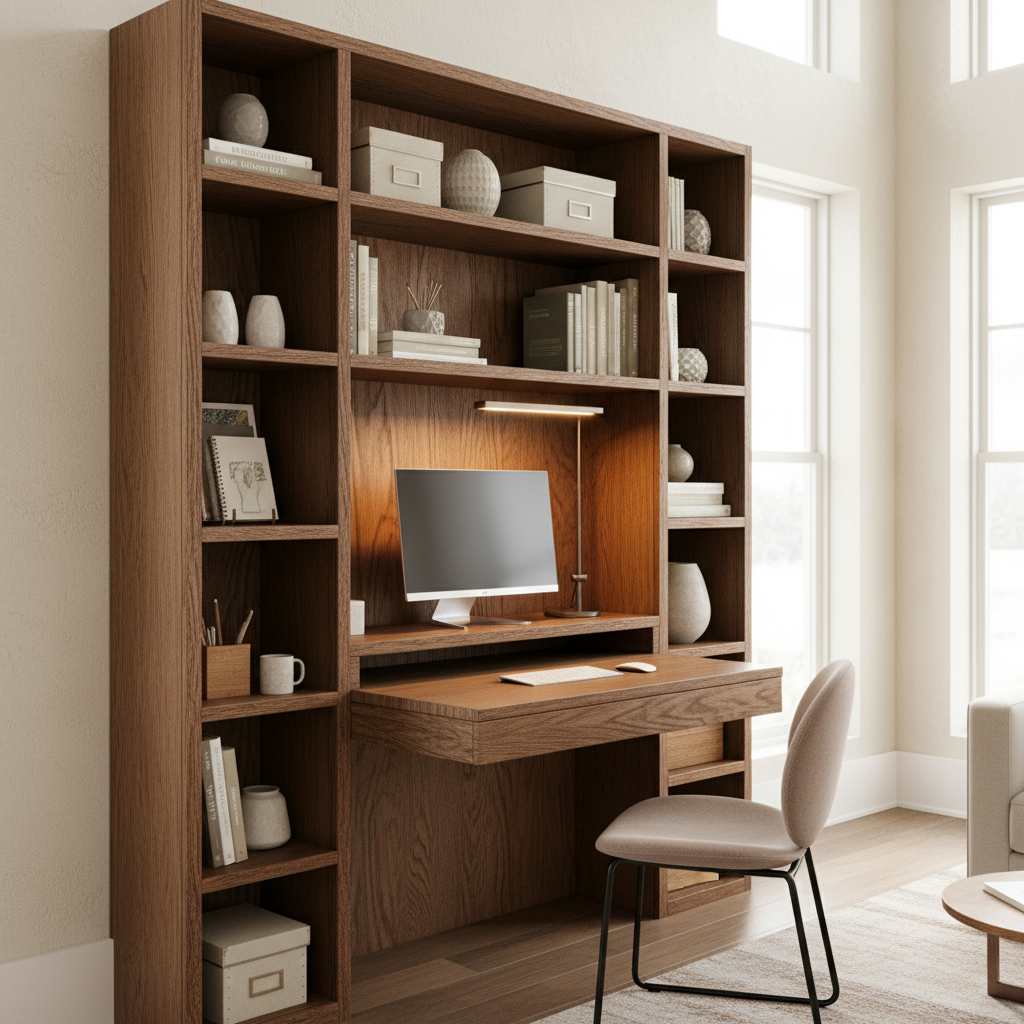 Combine your work and storage needs by integrating a desk surface directly into a tall bookshelf unit. This custom solution makes the most of vertical space, providing both a work area and shelving for books and decor. A unified material, like a continuous light wood or painted finish, ensures a cohesive and sophisticated look.