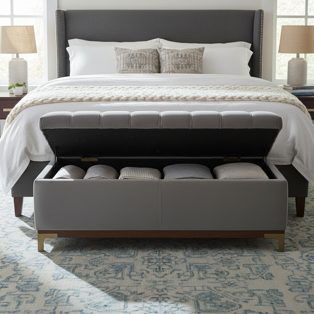 Place a stylish bench at the foot of your bed that doubles as a storage chest. This offers extra seating and a convenient spot to store blankets, pillows, or seasonal items. Choose an upholstered bench in a neutral fabric like linen or velvet for a touch of elegance and comfort. The mood is organized and inviting.