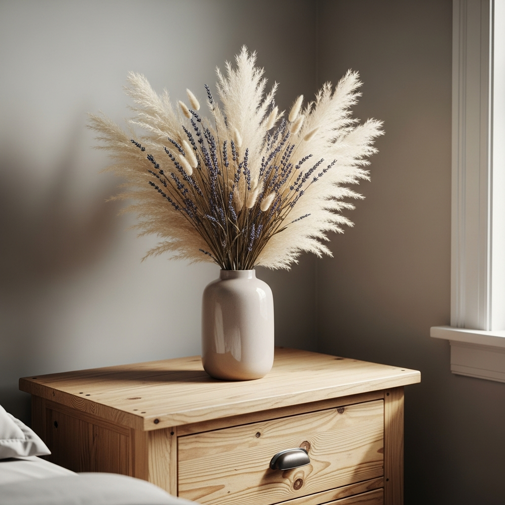 If fresh flowers are too high-maintenance, dried arrangements offer a beautiful, long-lasting alternative. Pampas grass, dried lavender, or bunny tails in muted tones provide a soft, architectural element to dressers and nightstands, maintaining a vintage-inspired spring look.