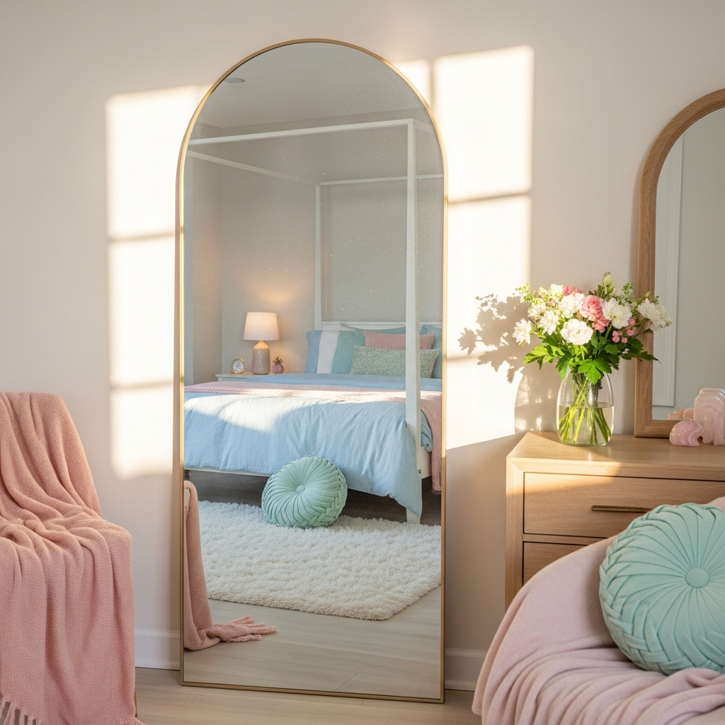 Mirrors are excellent tools for enhancing the soft aesthetic by bouncing light around the room. A large floor-length mirror with a thin gold or wood frame can make a small bedroom feel significantly more spacious and bright, capturing the essence of spring sunshine.