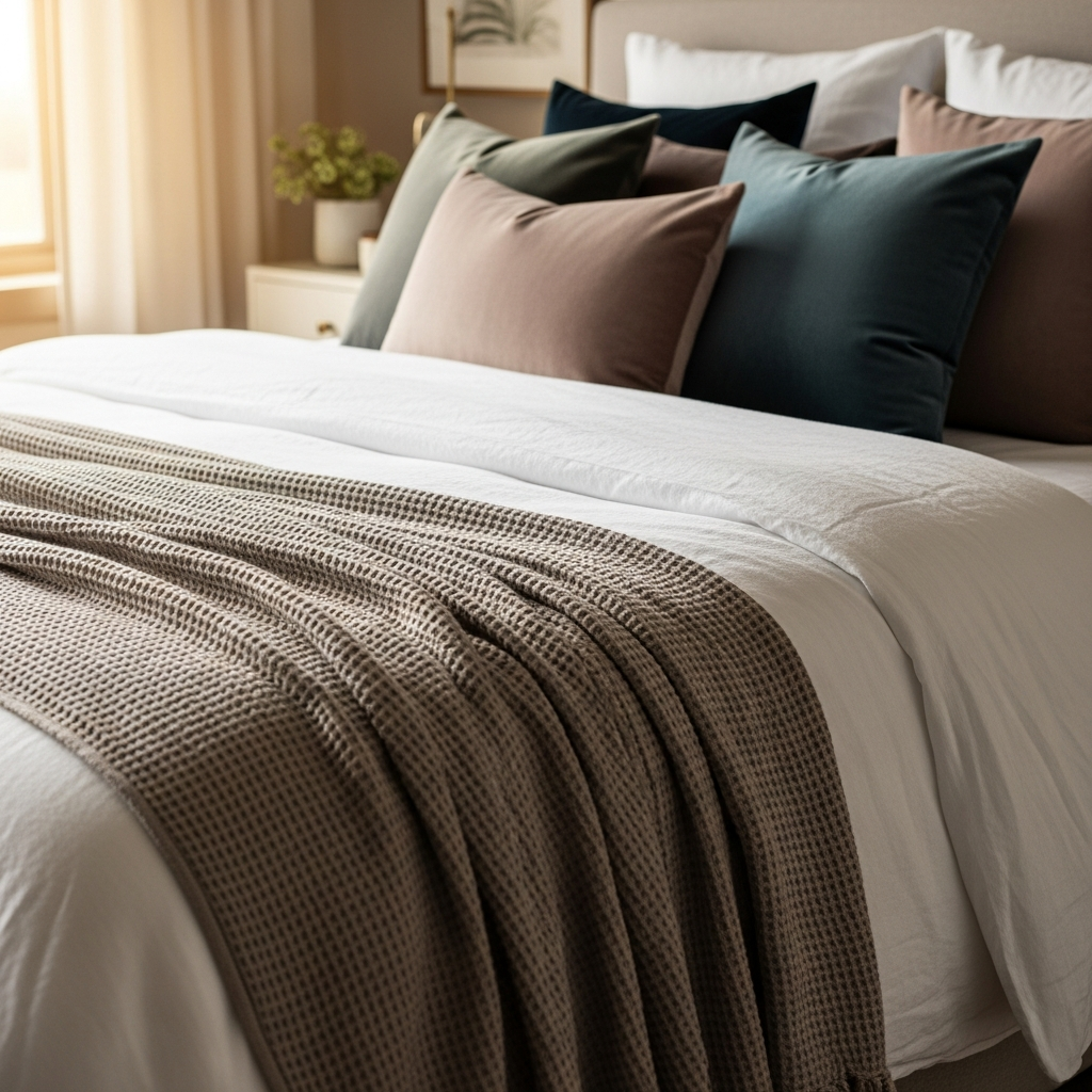 Even in spring, layering remains a key design principle for coziness. Mix different materials like cotton, silk, and light wool. A thin cotton waffle-weave throw at the foot of the bed adds visual interest and provides a functional layer for cooler spring nights.