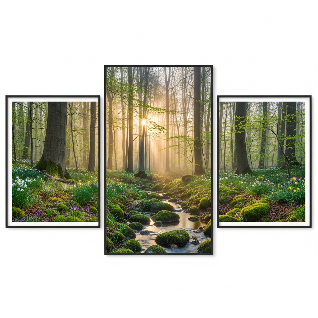 A triptych allows you to span a wide area of wall space with a single, cohesive botanical scene. A panoramic view of a budding spring forest or a misty meadow divided into three panels creates a window-like effect. This technique expands the visual space of a room and provides a deep sense of immersion in nature.