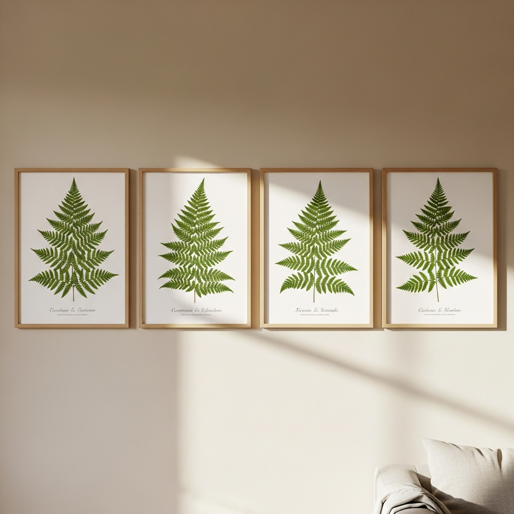 Utilizing vintage-style fern pressings provides a timeless and scholarly feel to your walls. The intricate details of the fronds are highlighted when set against a neutral parchment background. Pairing these prints with solid oak frames enhances the organic connection, making them ideal for a study or a hallway that needs a touch of classical greenery.