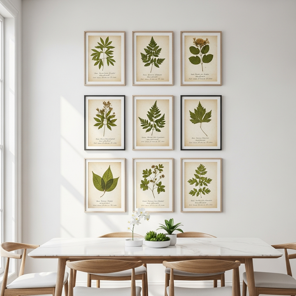 A gallery wall featuring a symmetrical grid of herbarium sheets creates a sense of order and botanical sophistication. By choosing a uniform set of frames, you can display a variety of medicinal plants or common herbs. This arrangement works exceptionally well in dining areas, offering guests a detailed look at the beauty of the natural world.