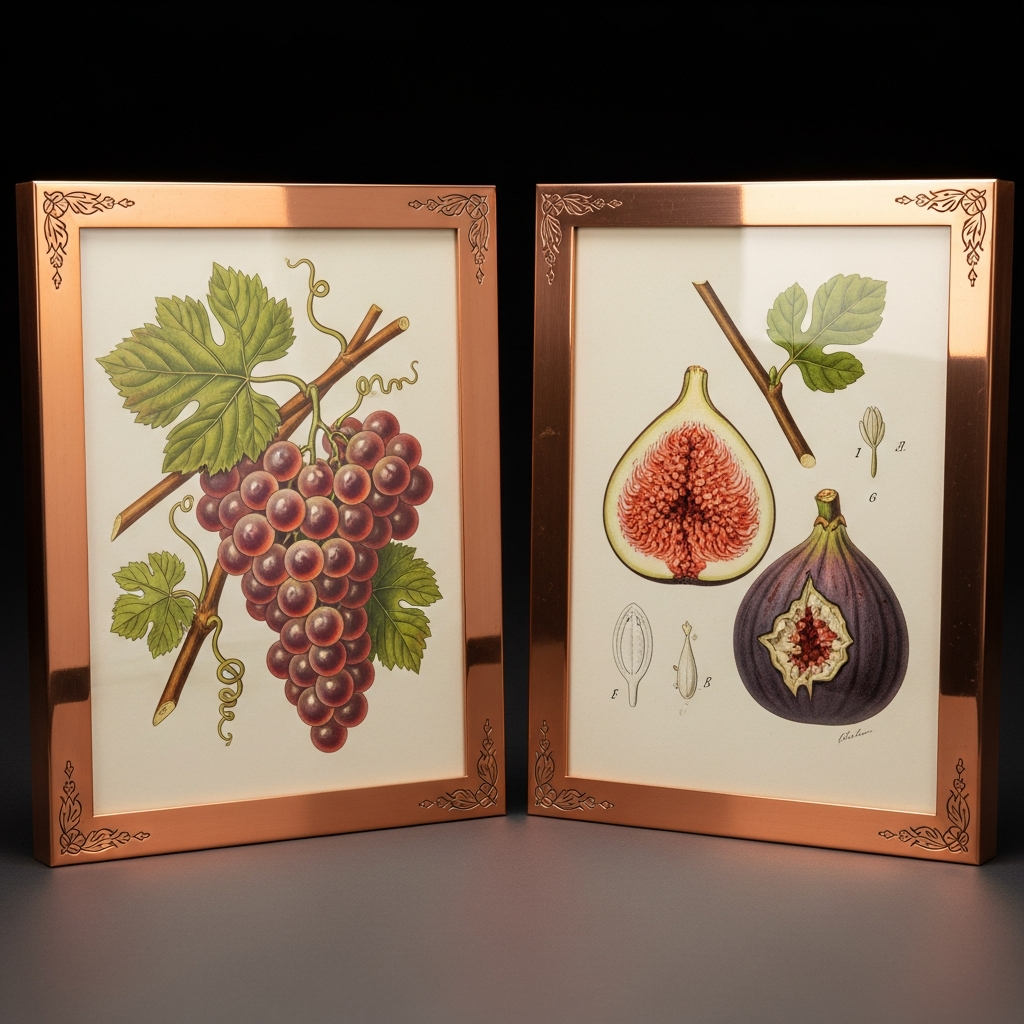 Copper frames add a touch of warmth and luxury to botanical art. Victorian-style botany plates, which often feature detailed drawings of fruits, flowers, and stems, look exceptionally sophisticated when paired with metallic accents. This style bridges the gap between traditional antique collecting and modern interior design.