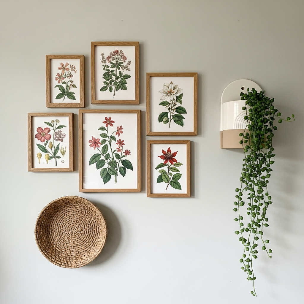 Create a personalized wall display by mixing botanical prints with other natural elements like small woven baskets, wooden carvings, or ceramic wall planters. This mixed media approach adds depth and personality to your decor. By layering different textures and materials, you can create a unique installation that celebrates the diversity of the natural world.