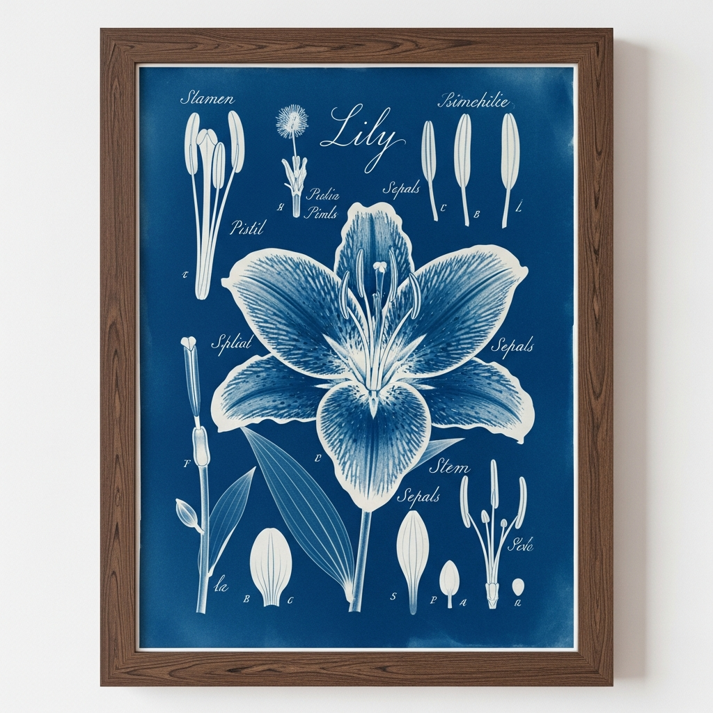 Cyanotype or blueprint-style botanical prints offer a deep blue palette that contrasts beautifully with natural wood furniture. These scientific-looking charts provide an educational and vintage atmosphere. They are particularly striking when used in home offices or libraries, where they evoke a sense of curiosity and exploration.