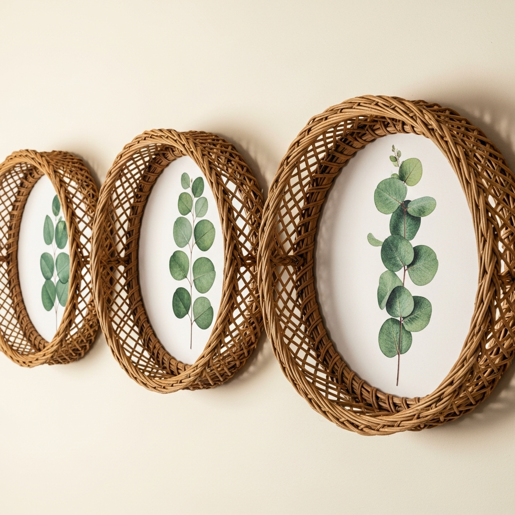 Combine texture and imagery by placing eucalyptus prints inside woven rattan frames. The warm tones of the rattan complement the silvery-green leaves of the eucalyptus, creating a coastal or bohemian feel. This combination is excellent for creating a relaxed, airy atmosphere in a living room or sunroom.
