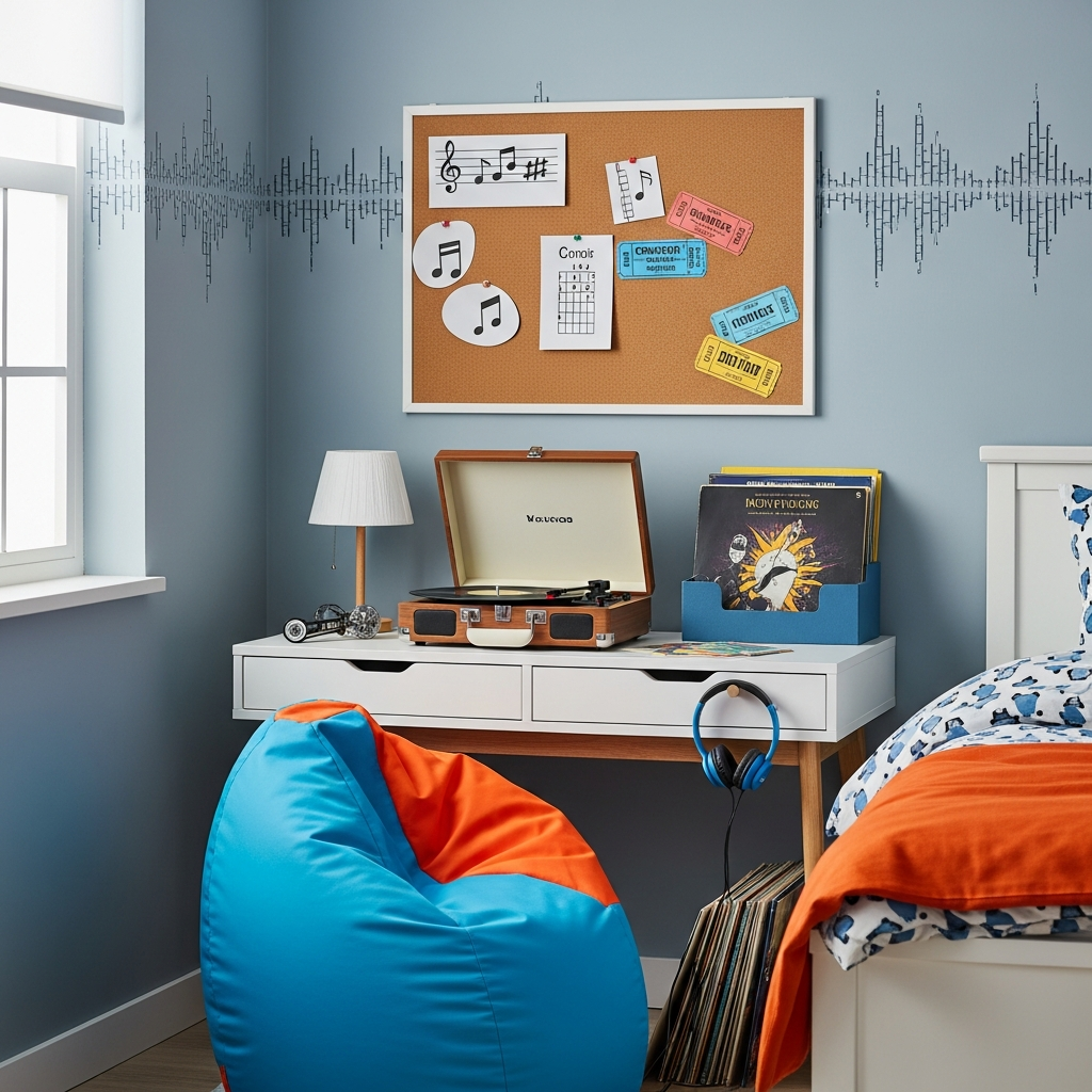 Materials and textures: Acoustic panels or fabric wall art, sleek metal or wooden shelving for instruments.