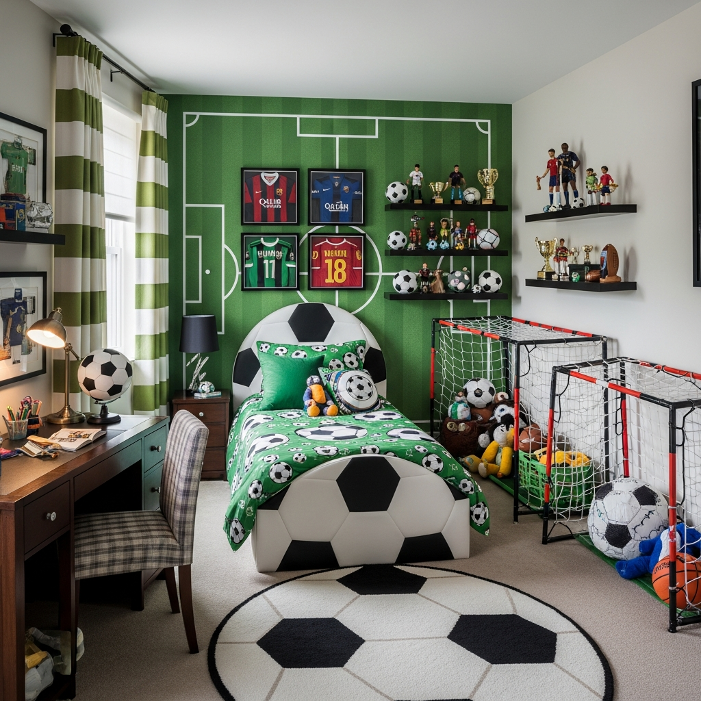 Furniture shapes: A bed shaped like a goalpost or a car, sports-themed dresser knobs. Shelves for trophies and memorabilia.