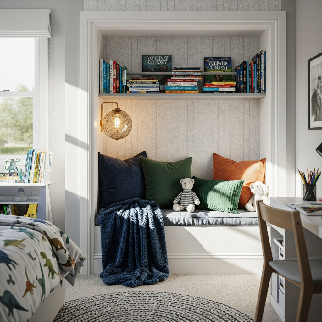 Materials and textures: Plush beanbag chair, soft throws, wool rug, sturdy wooden bookshelves.