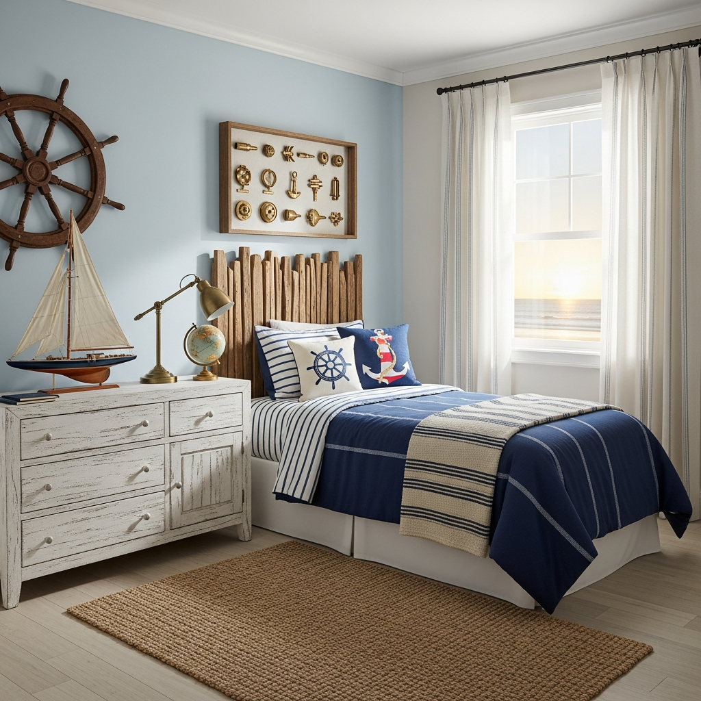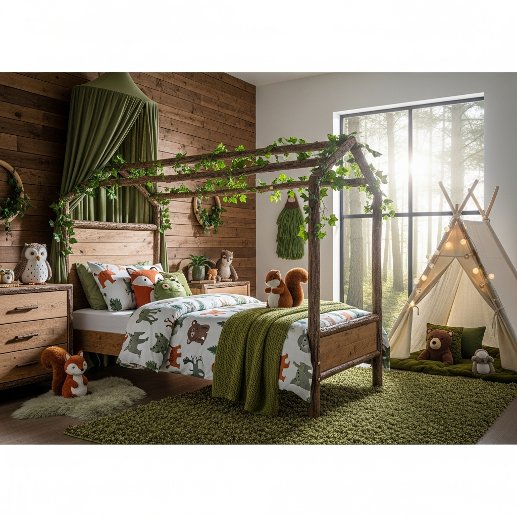 Materials and textures: Cotton bedding, durable laminate flooring or a turf-like rug, metal accents for shelving.