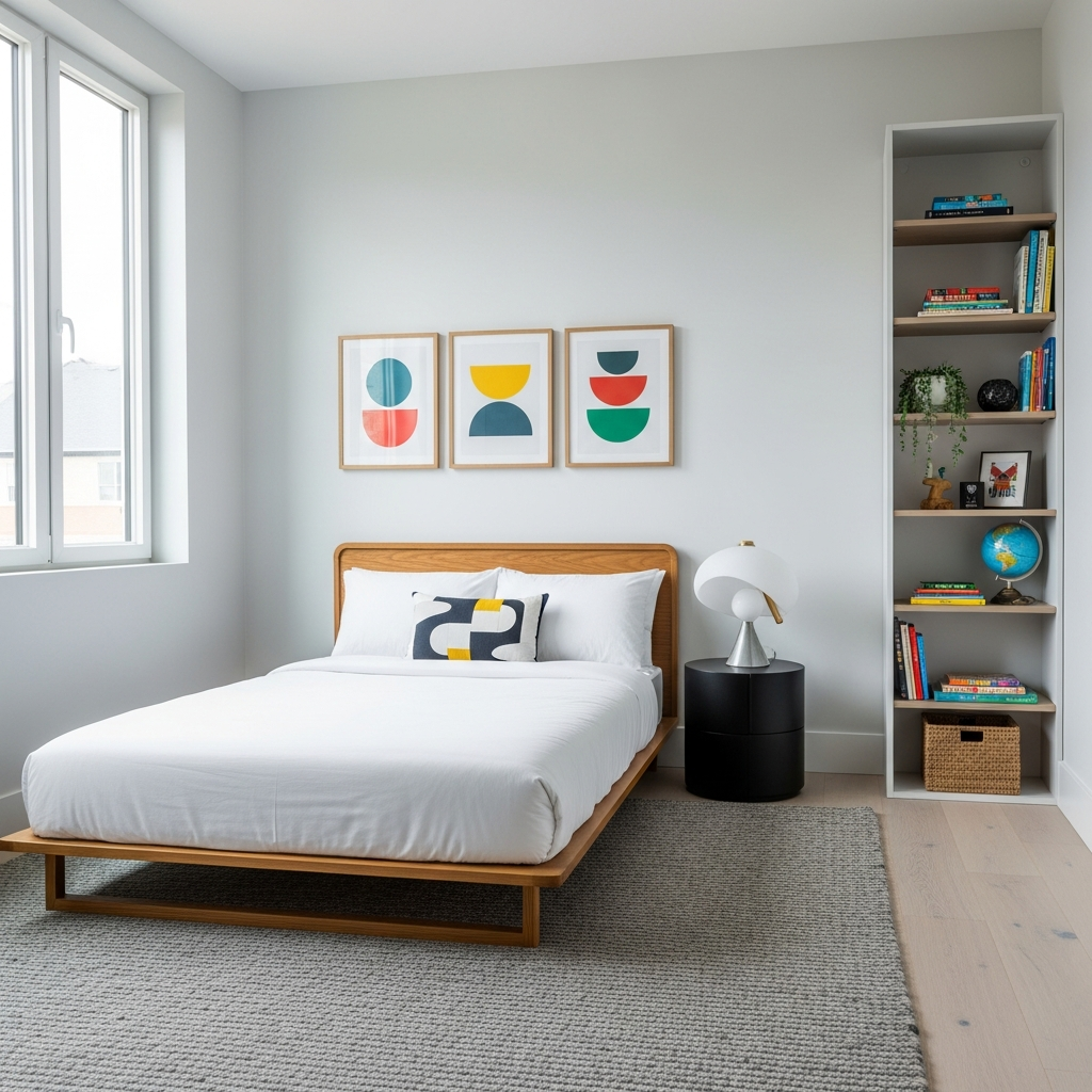 Furniture shapes: Streamlined bed frame, simple dresser, wall-mounted shelves.