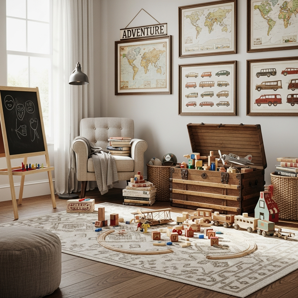 Materials and textures: Mid-century modern furniture, corduroy or tweed fabrics, classic wooden toys displayed.