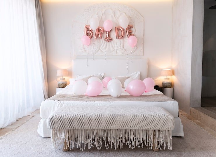 Soft pastels like blush pink, lavender, and cream create a romantic vibe. Tufted headboards, sheer curtains, and delicate lighting enhance femininity and comfort.