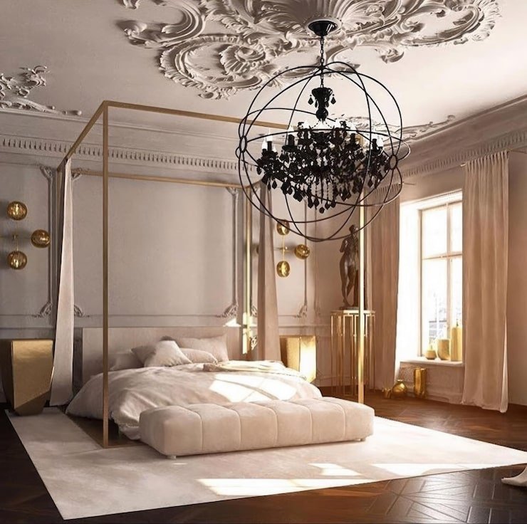Elegant, classic, and refined — Parisian-style bedrooms feature antique furniture, gilded mirrors, and luxurious fabrics. Soft color palettes add a feminine touch.