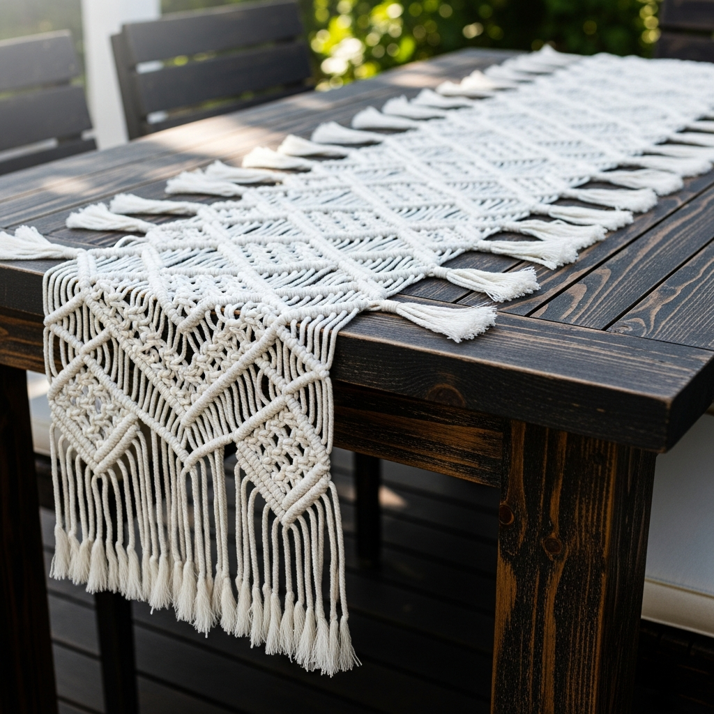 Macrame table runners or coasters add a relaxed, bohemian vibe to your garden party. The intricate knots and fringed edges provide visual interest and a soft texture. This style is perfect for more casual, low-seating garden gatherings where comfort and relaxation are the primary focus.