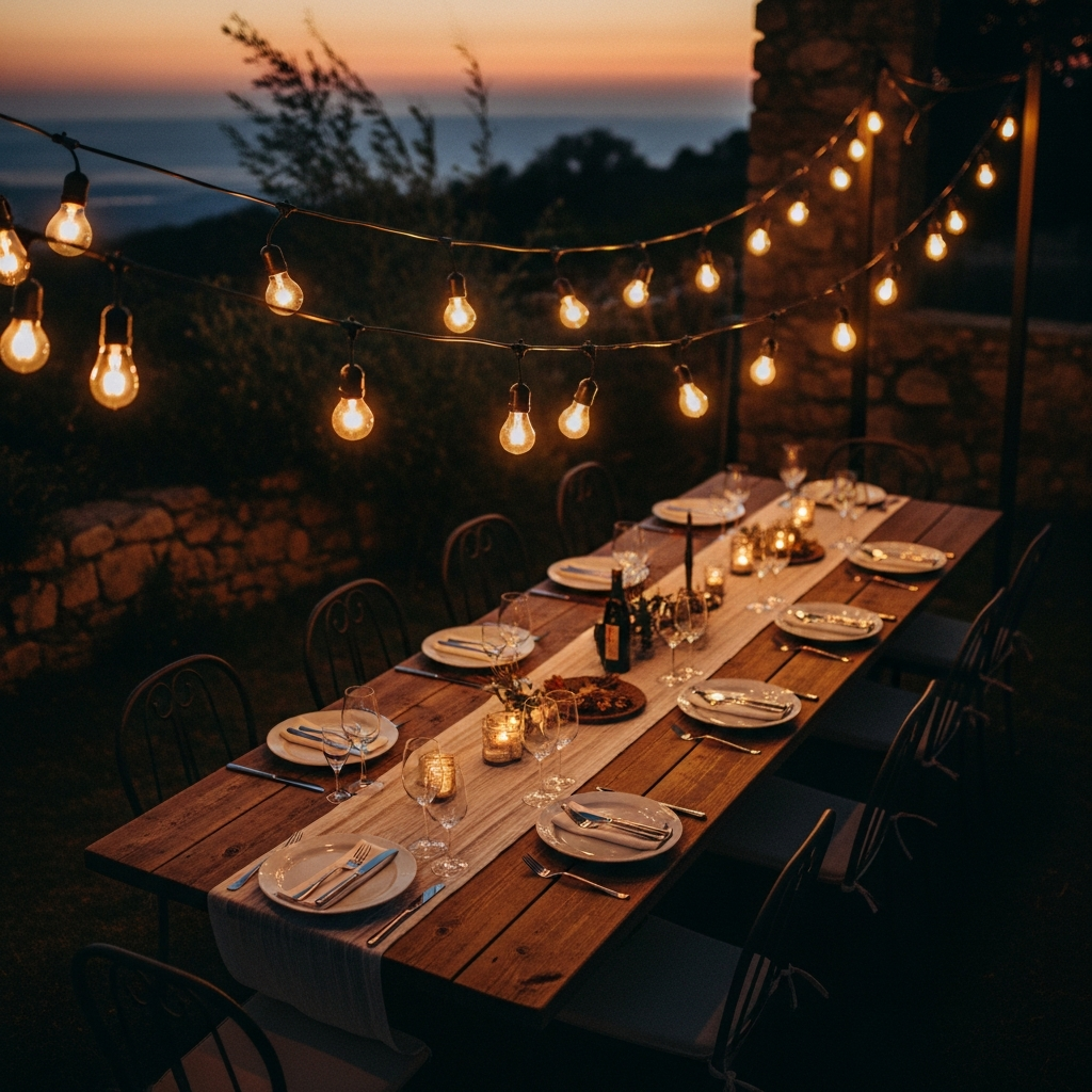 Lighting is crucial for transitioning your garden party from afternoon to evening. Hang Edison-style string lights or fairy lights directly above the dining table. The warm glow creates an intimate and magical atmosphere that encourages guests to linger long after the sun goes down.