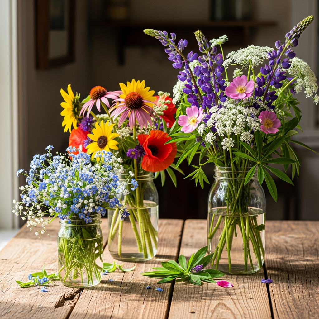For a rustic or farmhouse-style garden party, use clear mason jars as vases for wildflowers. Group them in sets of three at different heights to create depth. This look is approachable, charming, and celebrates the unrefined beauty of the summer season.