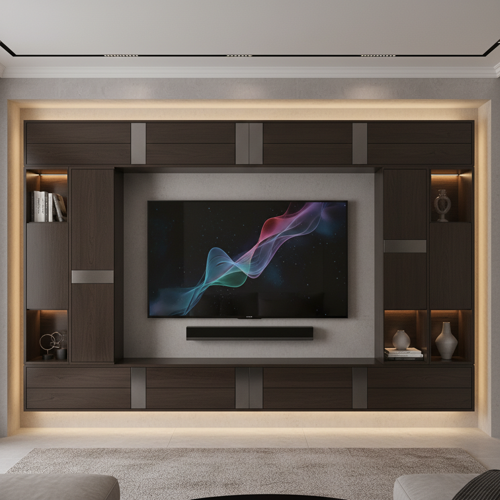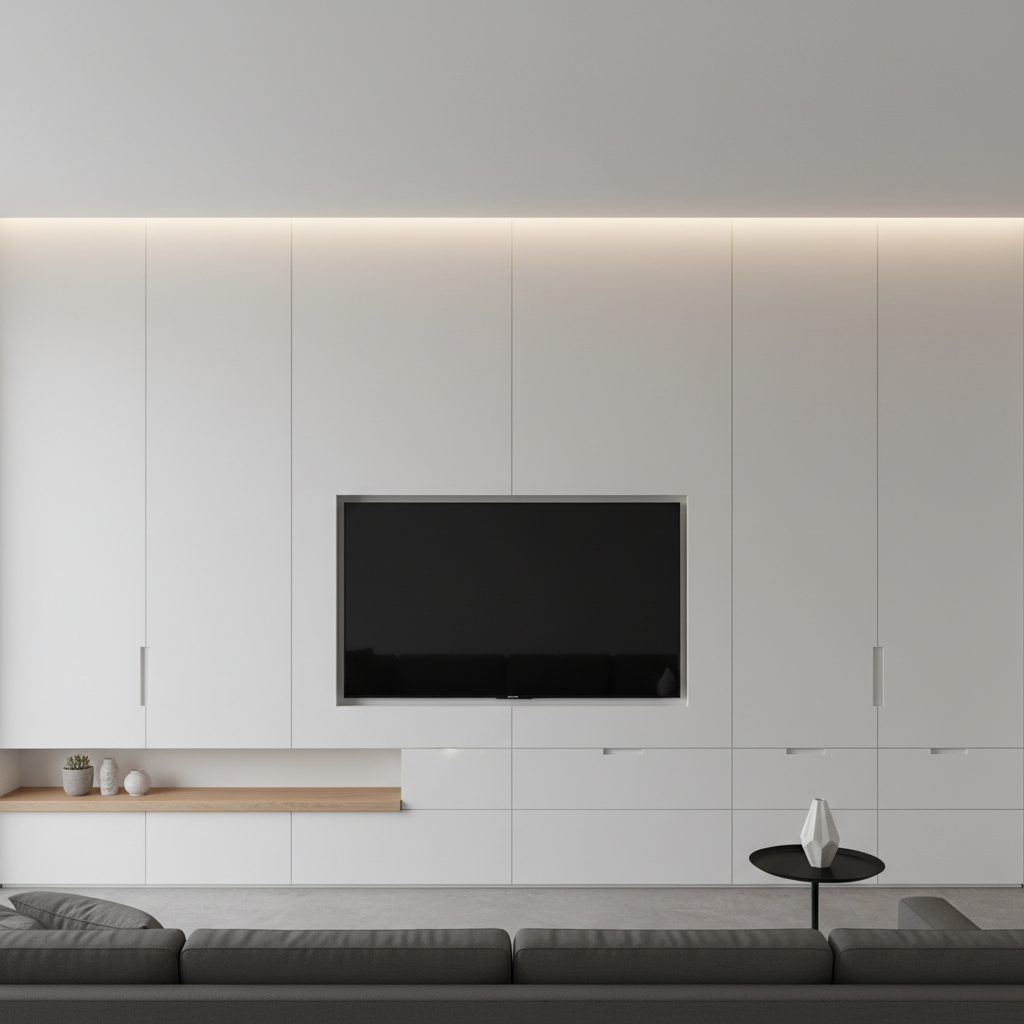 For an ultra-clean look, consider a design where storage is completely hidden behind flush panels. These panels might slide, pivot, or simply be push-to-open, revealing shelves or compartments only when needed. The TV itself can be mounted on one of these panels or integrated into a central section. This creates a highly sophisticated and minimalist aesthetic, ideal for maintaining a clutter-free environment.