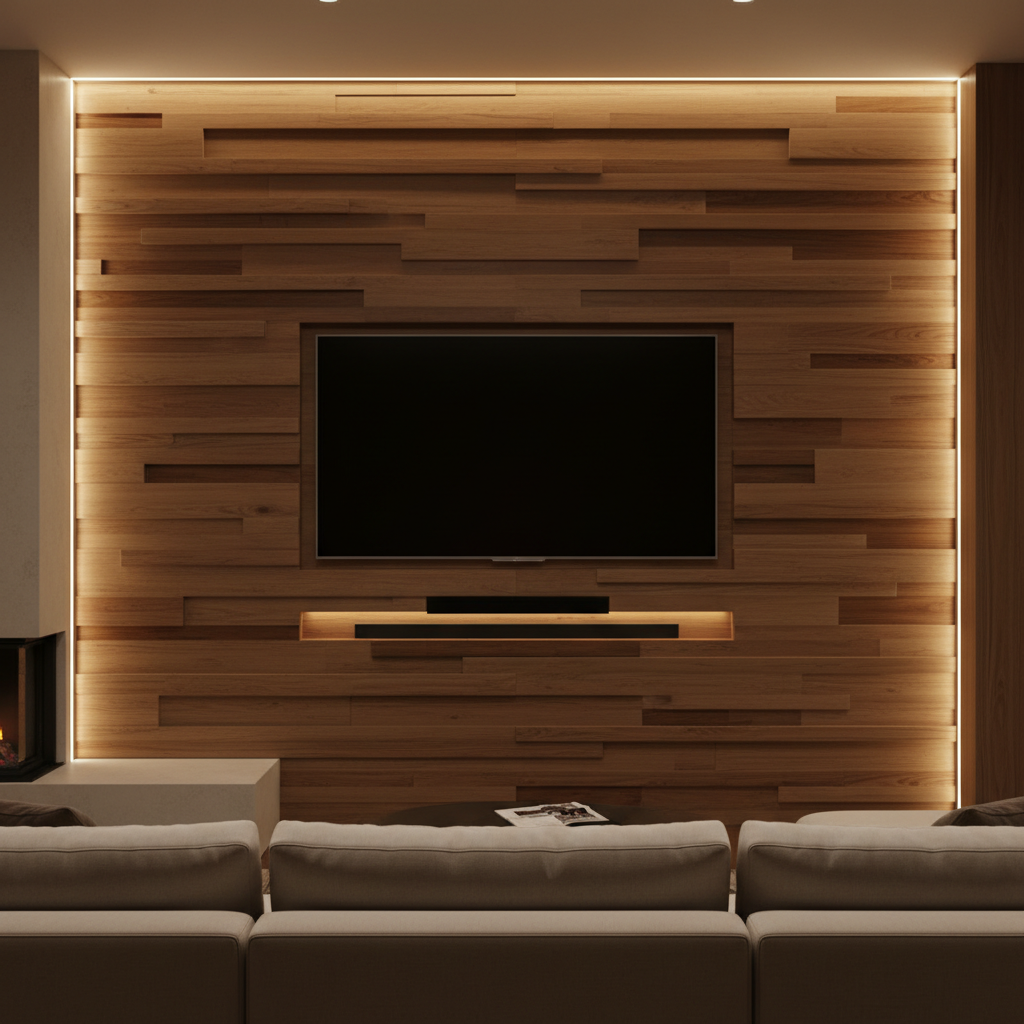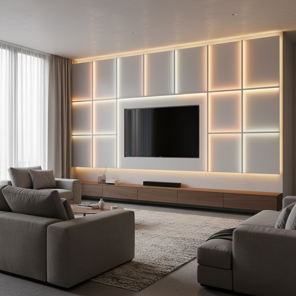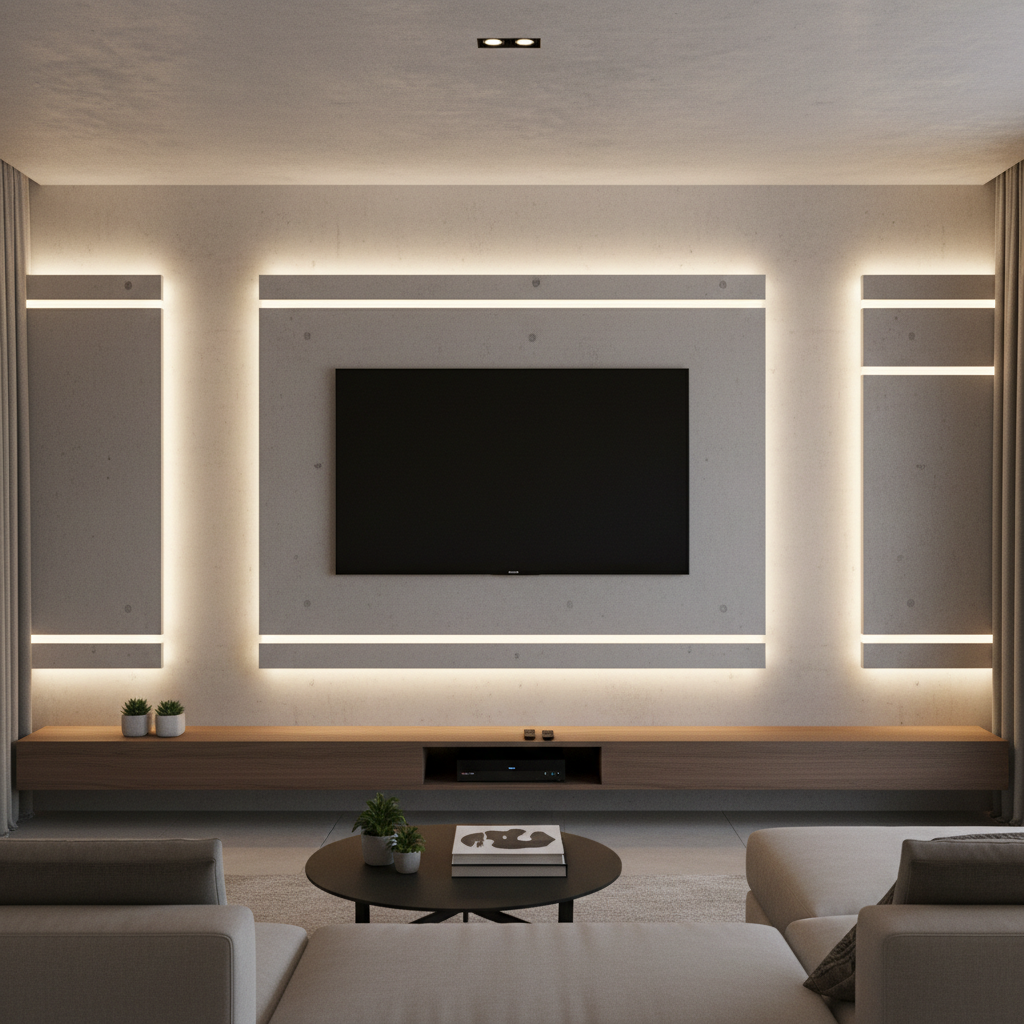 Embedding linear LED strips into custom-routed grooves within your wall panels creates a striking geometric pattern of light. This can be used to outline the television, create vertical or horizontal lines, or even form abstract designs. The effect is highly modern and architectural, adding a dynamic visual element to the living room.