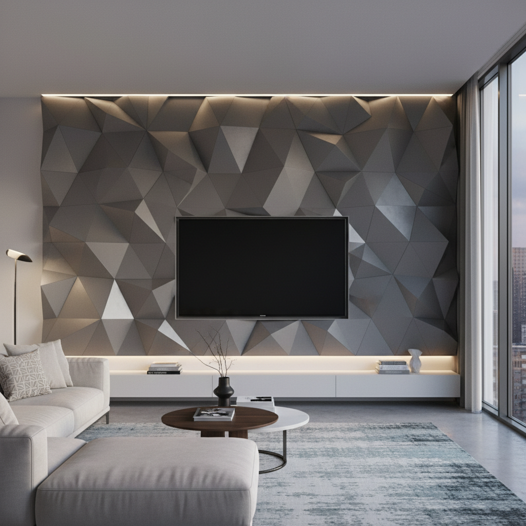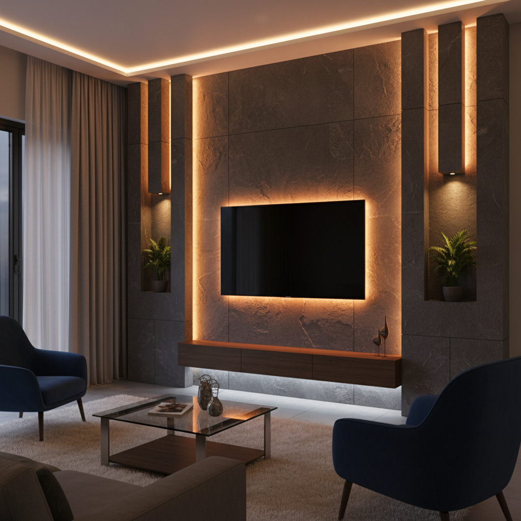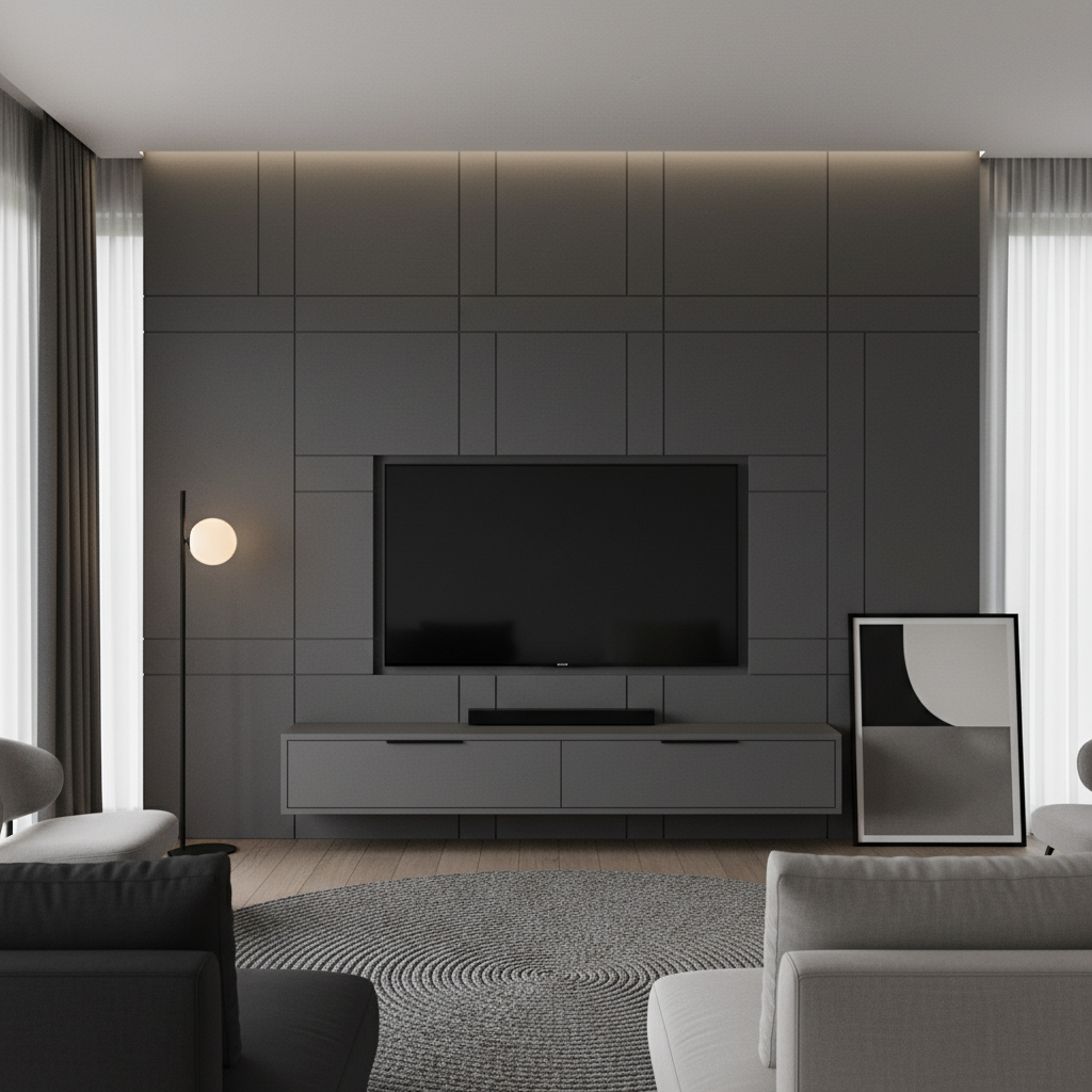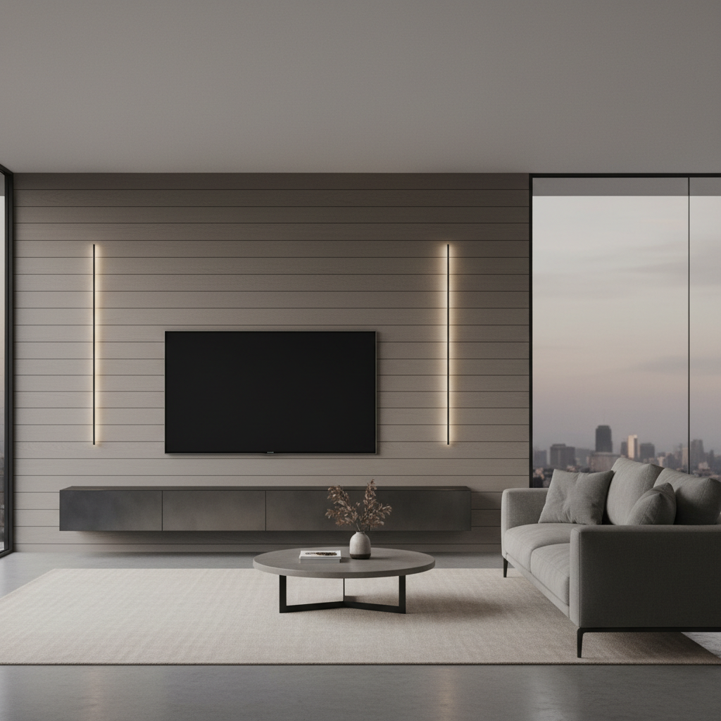 Embedding linear LED strips into custom-routed grooves within your wall panels creates a striking geometric pattern of light. This can be used to outline the television, create vertical or horizontal lines, or even form abstract designs. The effect is highly modern and architectural, adding a dynamic visual element to the living room.