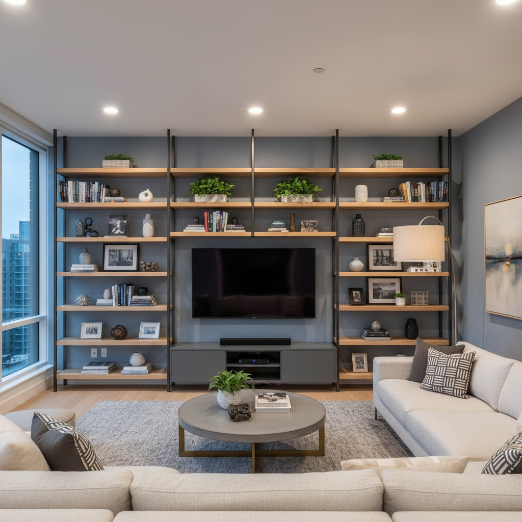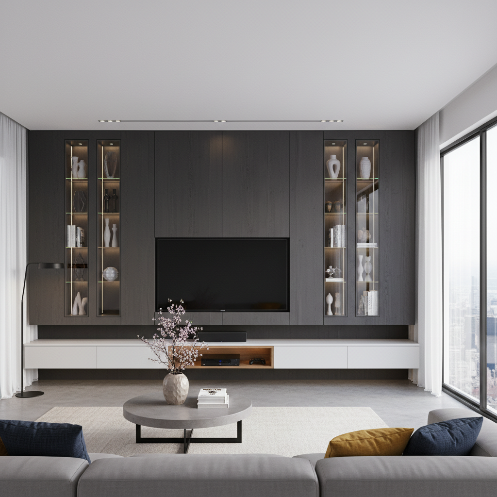 Custom-built cabinetry that surrounds or frames your television offers unparalleled storage. Floor-to-ceiling units, often with push-to-open doors for a handle-less look, can hide media components, books, and other essentials. This design creates a clean, architectural statement, often in contrasting colors or materials to add visual interest. It’s the epitome of organized elegance.