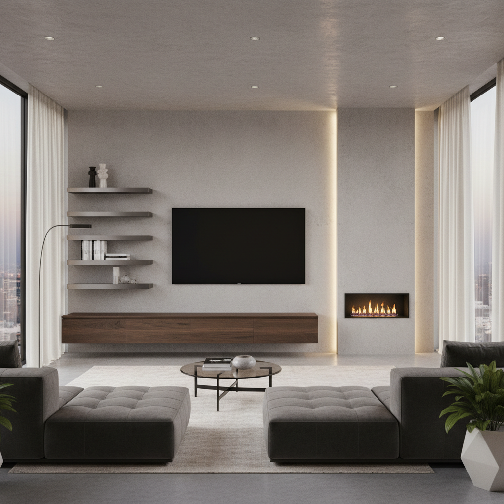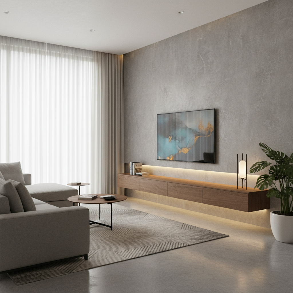 A cantilevered media unit extends horizontally from the TV wall, appearing to defy gravity. This design is incredibly sleek and architectural, often incorporating drawers or open compartments. The floating nature of the unit enhances the sense of space and adds a contemporary edge. Materials like polished concrete, engineered wood, or high-gloss lacquer work beautifully with this concept.