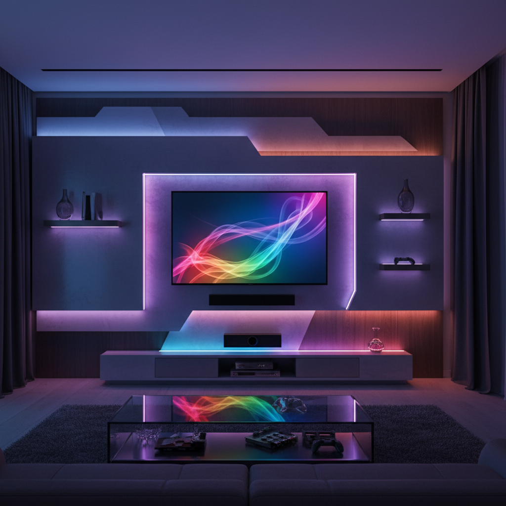 For a more playful and customizable ambiance, integrate color-changing RGB LED lighting. This allows you to adjust the mood of your living room with the touch of a button, matching the lighting to your entertainment or personal preference. It’s a fantastic way to add personality and a futuristic touch to your TV feature wall.