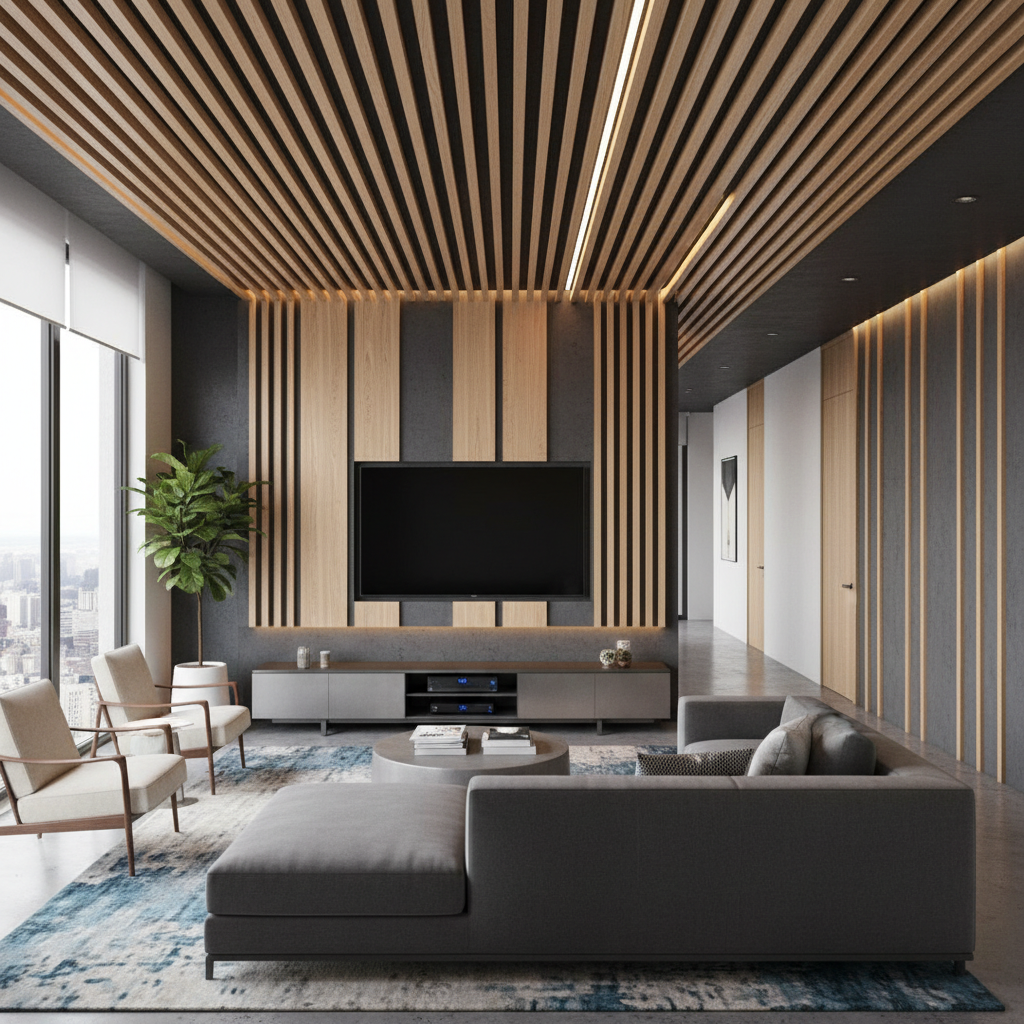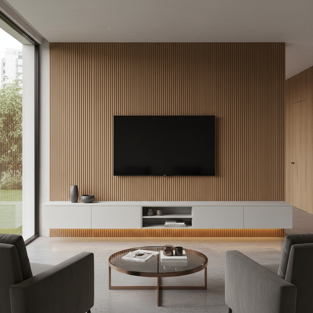 In open-plan spaces, a slatted wood screen can serve as both a TV feature wall and a subtle room divider. The slats allow light to filter through, maintaining an open feel while defining distinct zones. The TV can be mounted directly onto a solid panel integrated within the screen, offering a stylish and functional separation.