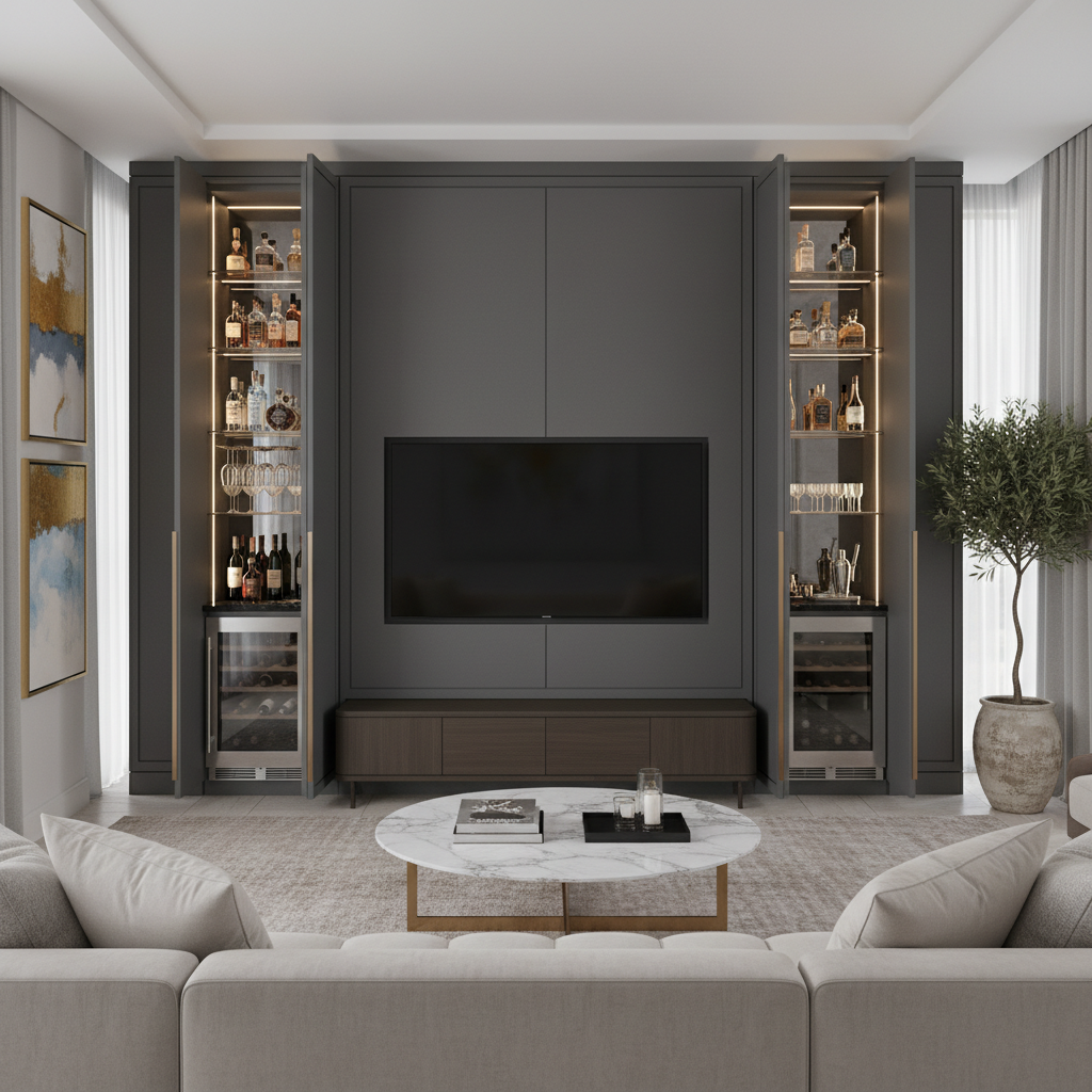 Maximize functionality by incorporating a hidden bar or coffee station within your TV feature wall. Behind flush panels, you can conceal shelves for bottles, glassware, or a coffee machine, creating a discreet hospitality zone. This ingenious design allows for entertaining without cluttering the main living space.