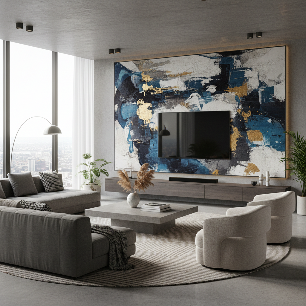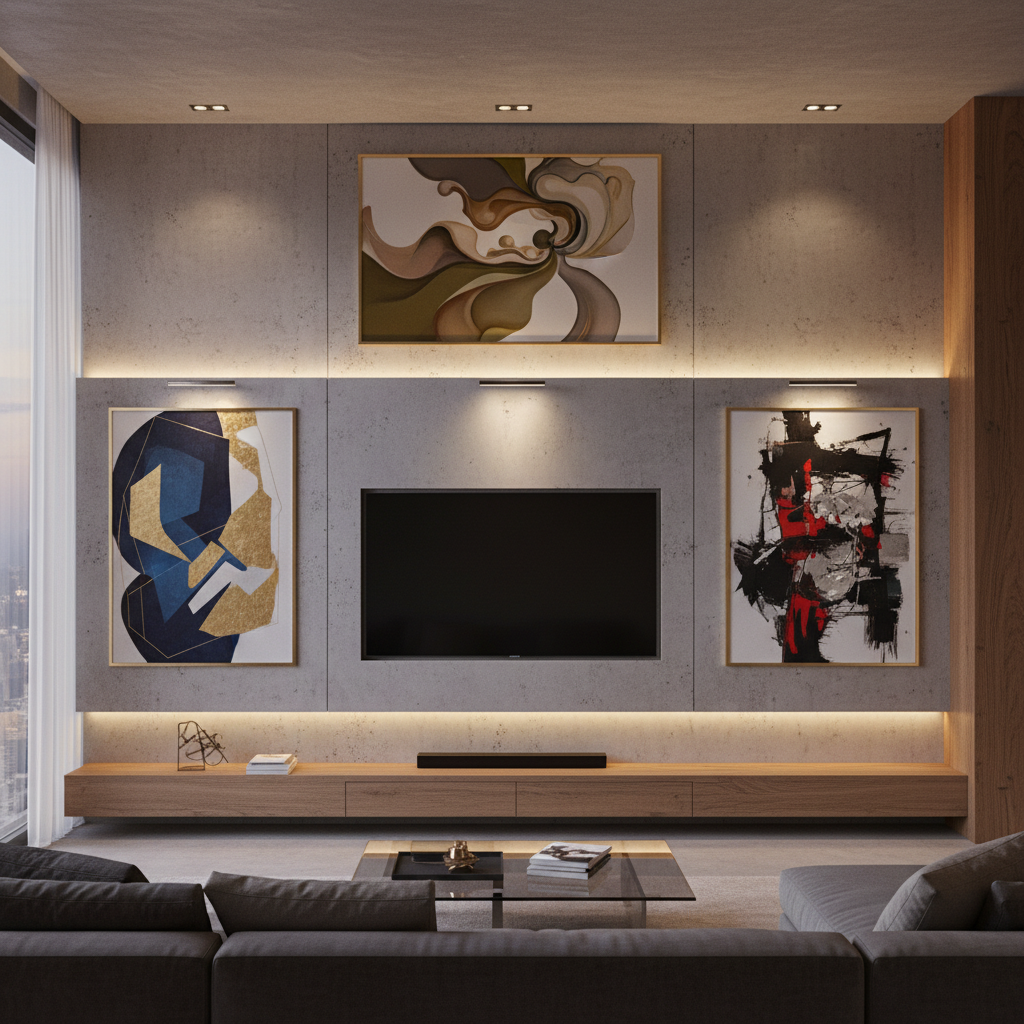 Mount your television onto a large format art panel rather than directly on the wall. This panel can be a piece of abstract art, a textured material, or even a custom-printed graphic. When the TV is off, the panel becomes the primary artwork, disguising the screen and adding a sophisticated, gallery-like feel to your living room.