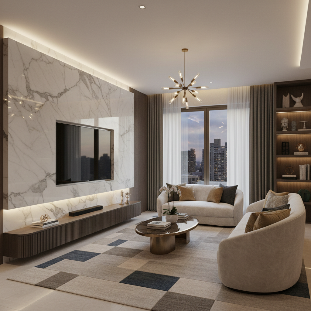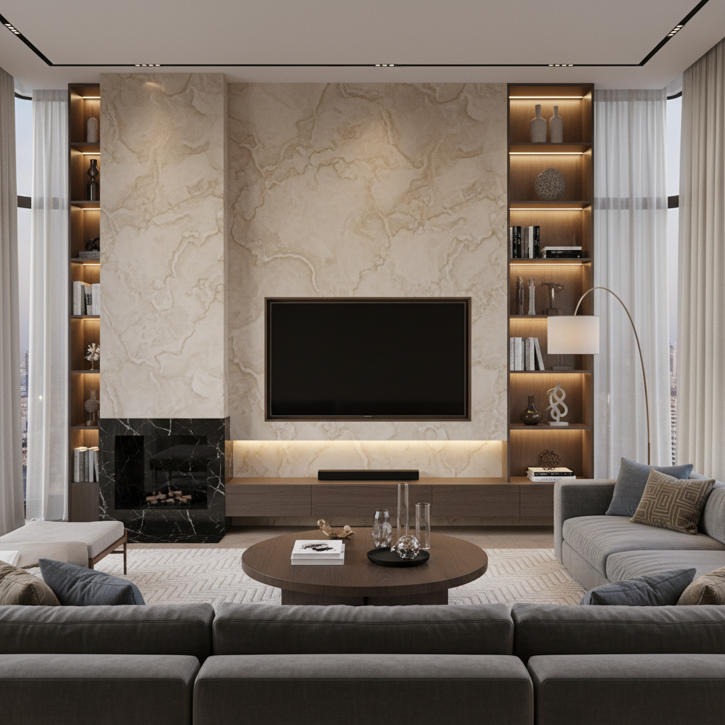 Nothing says luxury quite like a grand marble slab. A TV feature wall clad in a single, large slab of richly veined marble—think Calacatta, Carrara, or Nero Marquina—becomes an instant showstopper. The television is mounted directly onto the marble, allowing its natural patterns to become the primary artwork. This design creates an opulent and sophisticated atmosphere, often complemented by brass or gold accents in nearby decor.