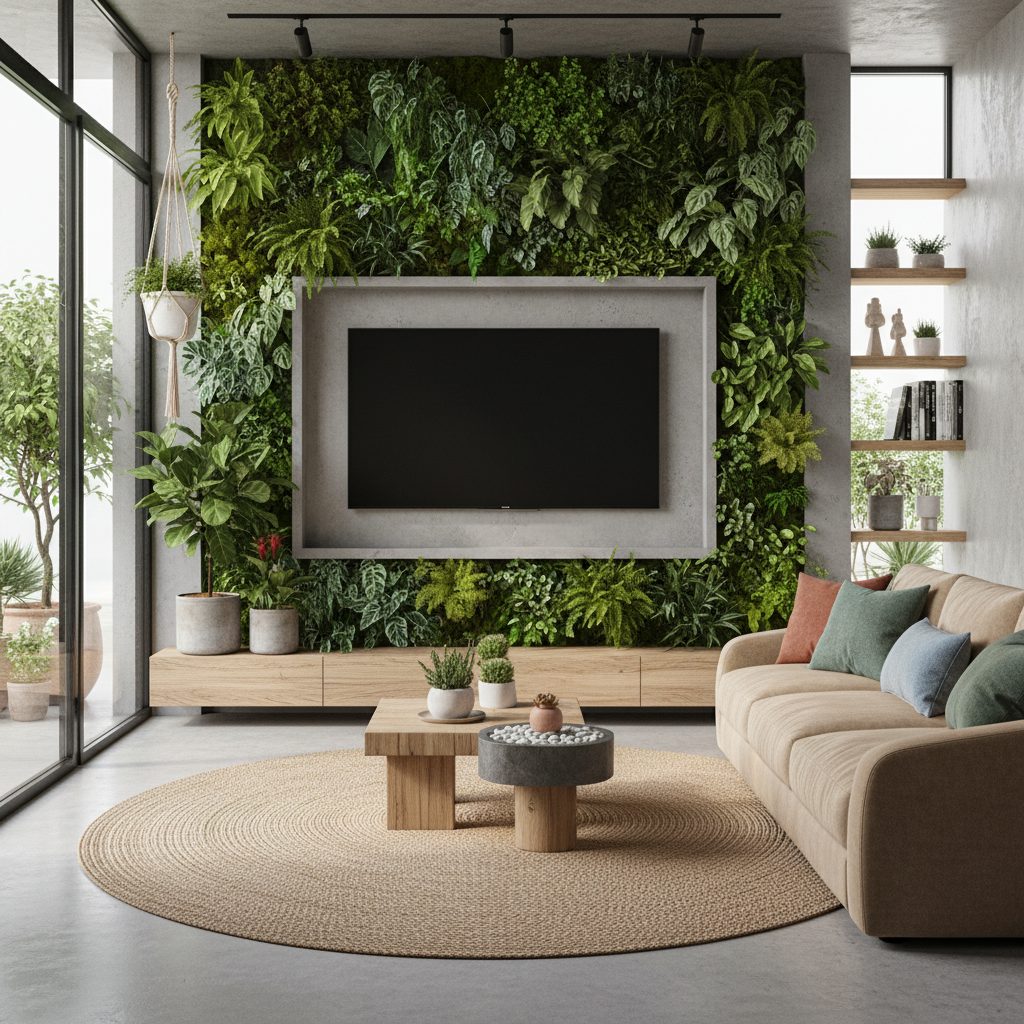 Bring nature indoors with a vertical garden or green wall surrounding your television. This biophilic design adds freshness, natural texture, and a living element to your space. It’s a unique and refreshing approach that softens the technology and creates a calming, natural oasis. Ensure proper irrigation and lighting for the plants.