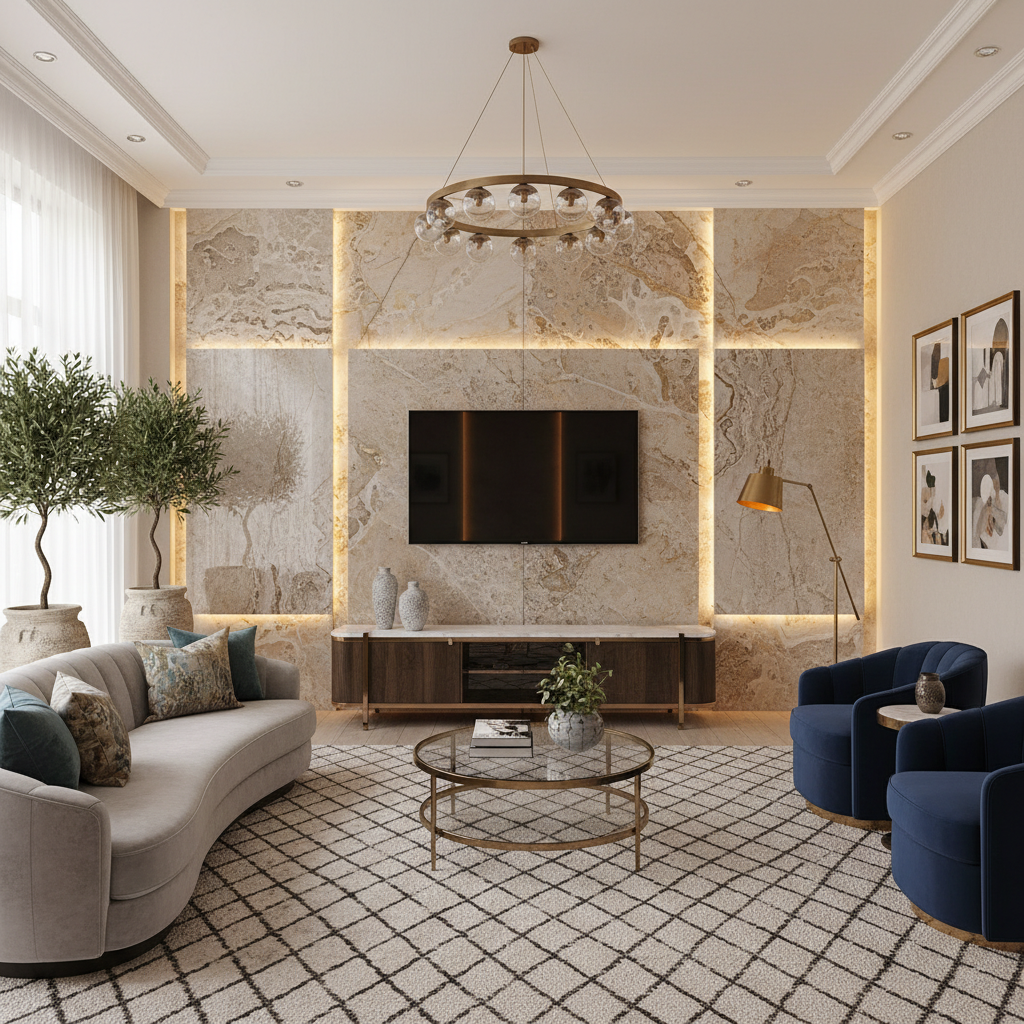 Similar to onyx, backlit stone veneer offers the beauty of natural stone with added luminosity. Thin slices of natural stone are applied to a substrate and backlit, creating a soft, glowing effect that highlights the stone’s unique patterns. This design brings a touch of natural luxury and serene ambiance to your living room.