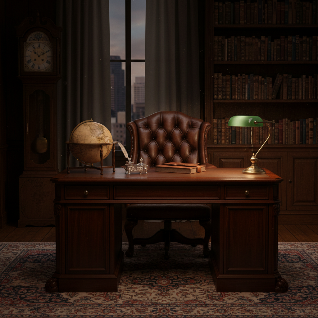 Imagine a space that exudes power and intellect. This design centers around a grand, solid wood desk—think mahogany or cherry—paired with a deep-buttoned, tufted leather executive chair in rich browns or oxblood red. The color palette leans towards deep jewel tones like forest green or navy blue, complemented by warm neutrals. Materials like polished brass for lighting and leather-bound books add to the sophisticated atmosphere. Furniture silhouettes are substantial and traditional, creating a mood of serious scholarship and timeless authority.