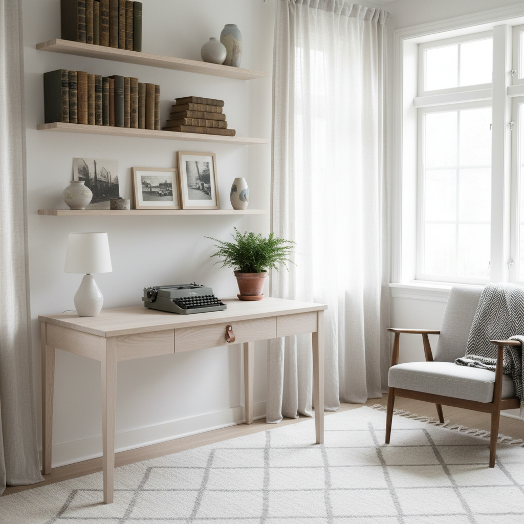 Combining vintage charm with minimalist functionality, Scandinavian Vintage emphasizes light, natural materials, and uncluttered spaces. A simple, well-crafted desk in light wood like birch or ash, often with tapered legs, is central. The color palette is largely neutral—whites, grays, and natural wood tones—with subtle pops of color. Materials include wool, cotton, ceramics, and warm metals. Furniture silhouettes are clean and functional, fostering a calm, organized, and inspiring environment.