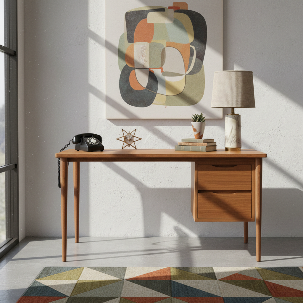 Clean lines, organic shapes, and a forward-thinking aesthetic characterize Mid-Century Modern. A sleek, minimalist desk in teak, walnut, or rosewood is paramount, often paired with an iconic Eames-style chair. The color palette combines earthy tones—avocado green, mustard yellow, burnt orange—with crisp white or black. Materials like polished wood, woven fabrics, and chrome accents are common. The overall mood is one of sophisticated simplicity, functional beauty, and a cool, retro-futuristic charm.