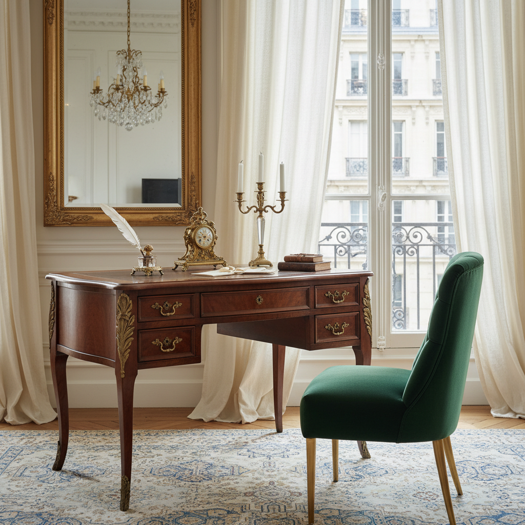 For a lighter, more romantic vintage feel, the Parisian Chic study nook is ideal. This style favors a delicate, often white or pastel-painted writing desk with ornate, curved legs. A plush velvet chair in blush pink, soft grey, or emerald green provides a luxurious touch. The color palette is airy, featuring muted tones, soft golds, and off-whites. Materials include gilded mirrors, crystal accents, and light-filtering sheer curtains. The mood is one of refined elegance, creativity, and understated glamour.