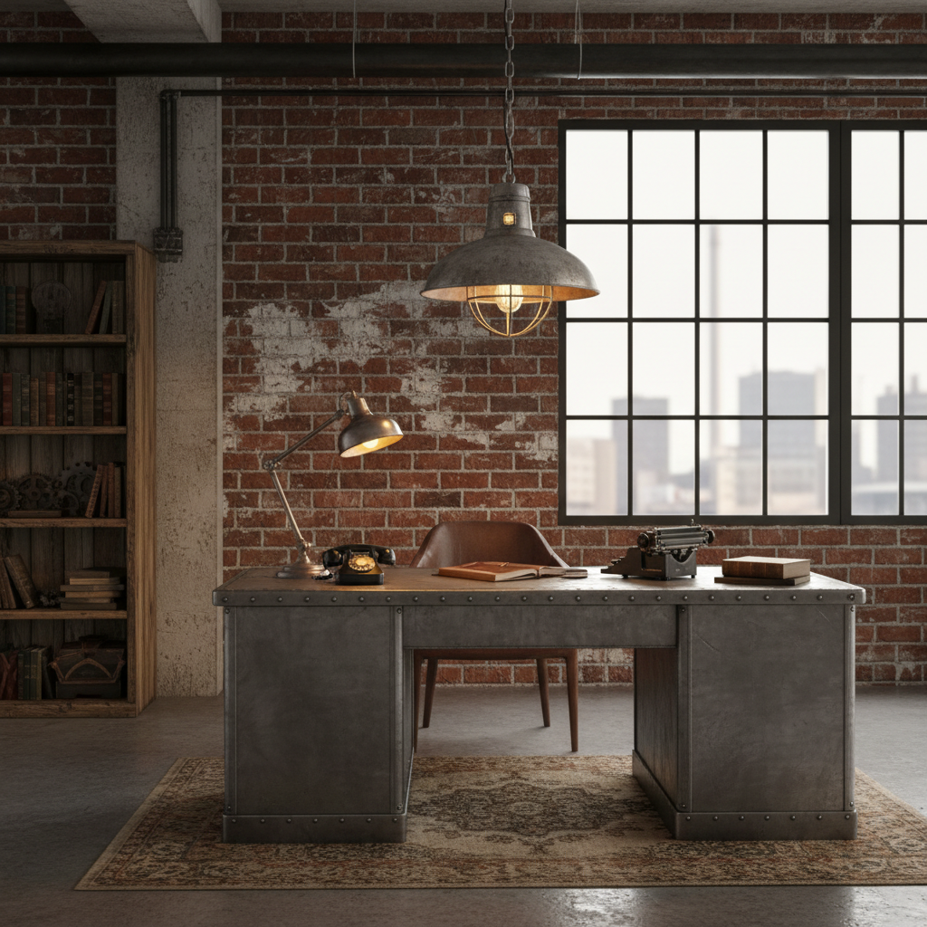 Celebrating raw materials and utilitarian design, the Industrial Loft office is rugged yet stylish. Picture a sturdy metal and wood desk, perhaps salvaged from an old factory, complemented by an ergonomic drafting stool. The color scheme embraces grays, blacks, and natural wood tones, with pops of rust or deep teal. Exposed brick walls, concrete floors, and visible pipework define the backdrop. Materials like distressed leather, blackened steel, and Edison bulb lighting create a functional, artistic, and robust atmosphere.