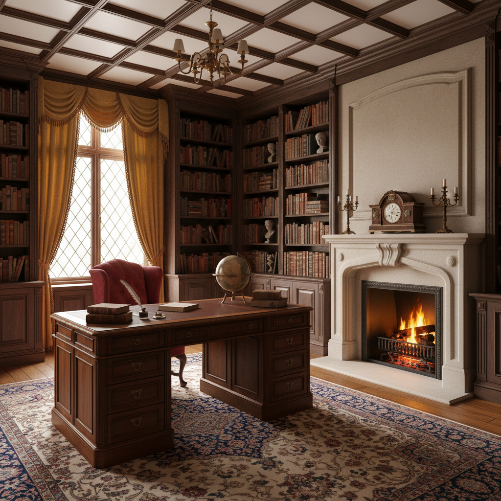Step into an era of grand intellect with a Victorian Library office. Towering bookshelves filled with leather-bound volumes, a massive mahogany desk, and a high-backed, upholstered armchair create a scholarly atmosphere. The color palette is rich and deep—burgundy, emerald, dark wood tones. Materials include heavy velvet drapes, intricate wood carvings, and ornate brass fixtures. The mood is one of serious contemplation, profound comfort, and old-world grandeur, perfect for deep work and reflection.