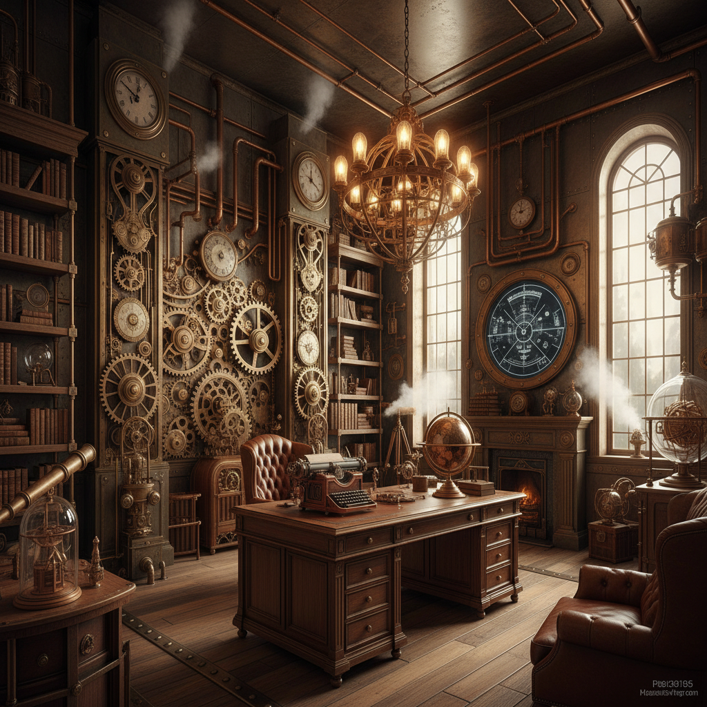 Dive into an imaginative world with a Steampunk Inventor’s Workshop. This unique style features a robust wooden desk with visible gears or metal accents, paired with a leather-upholstered chair that looks like it belongs in a Victorian airship. The color palette is rich and earthy—deep browns, coppers, brass, and muted greens. Materials include polished brass, copper, distressed leather, exposed pipes, and intricate clockwork. The mood is adventurous, inventive, and deeply imaginative, perfect for innovation.