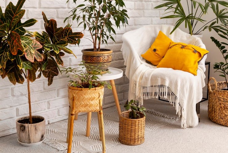 Use wooden furniture, woven baskets, and plants to bring nature inside. Natural materials create warmth, balance, and texture that make the room feel more grounded and alive.